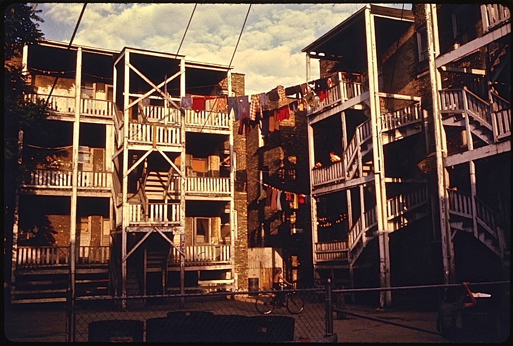 Lyon‘s original caption continues: “The inner city today is an absolute contradiction to the Main Stream America of gas stations, expressways, shopping centers and tract homes. It is populated by Blacks, Latins and the white poor. Most of all, the inner city environment is human beings, as beautiful and threatened as the 19th century buildings.”