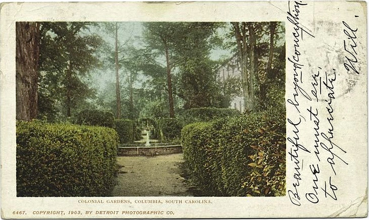 Colonial gardens, Columbia, South Carolina, ca. 1900, by Detroit Publishing Co., via The New York Public Library. (Click the image to enlarge it — or here.)