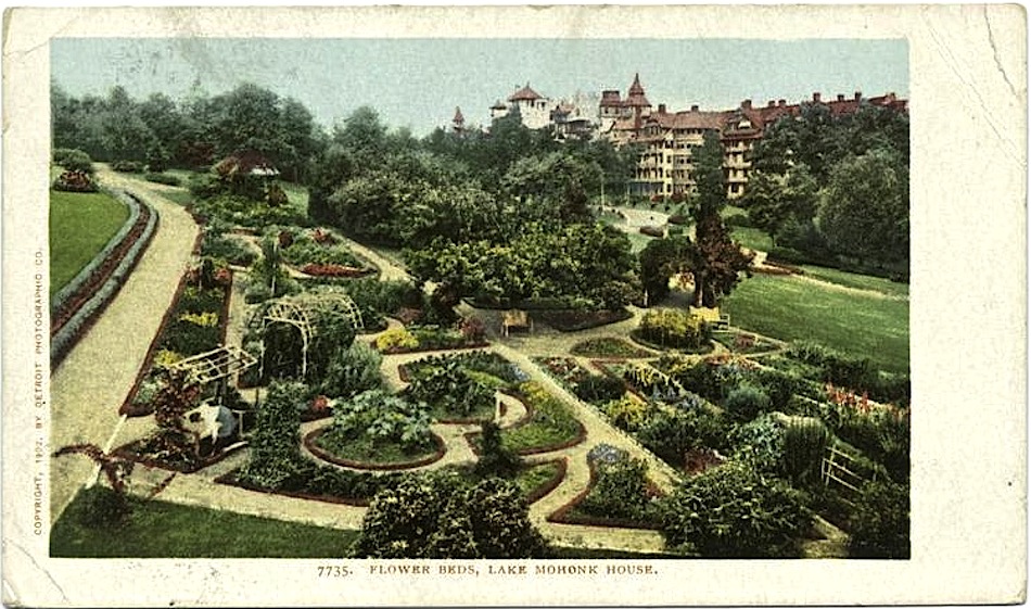 The flower gardens of Lake Monhonk Mountain House, Ulster County, New York, ca. 1902, a postcard by Detroit Publishing Co., via The New York Public Library Digital Collections.
