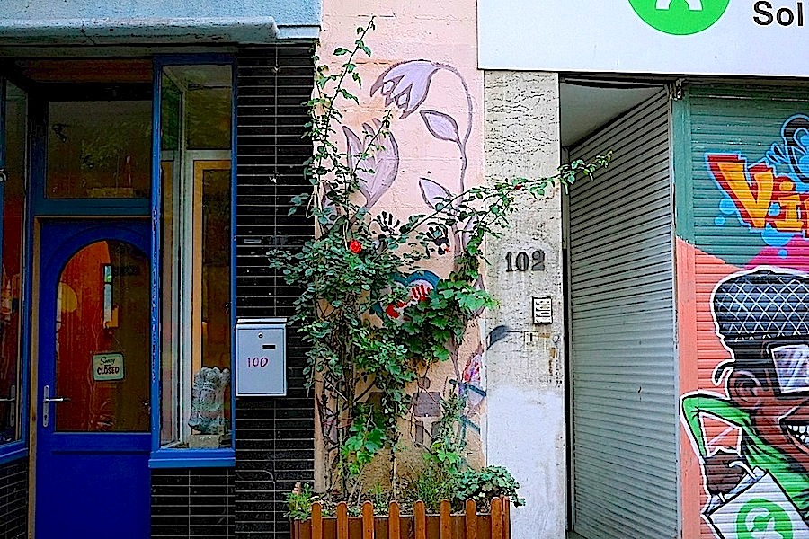 Above, a mass of vines shades a closed storefront, also along Rue de Flandre.