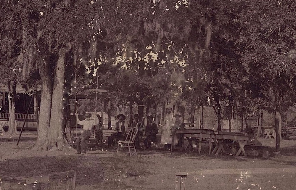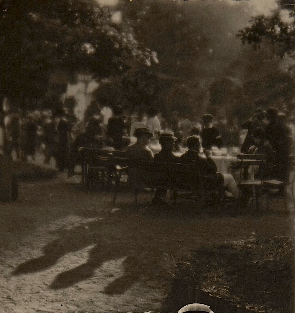 Five adults and two children at wooden tables beneath the large trees of Pressler’s Beer Garden, Austin, Texas, between 1890 and 1910, by Samuel B. Hill, via Austin Public Library and The Portal to Texas History (University of North Texas Libraries).