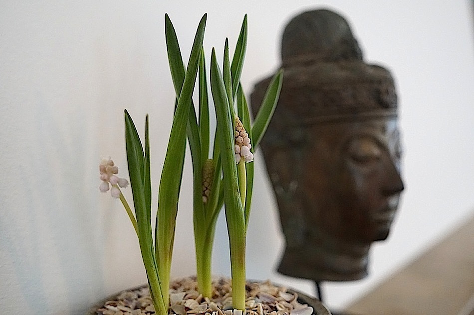 I don’t remember where I bought the little clay pots — probably at a thrift store back in Maryland more than ten years ago. The Muscaris came from the Schillerplatz Saturday flower market.