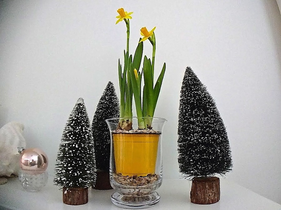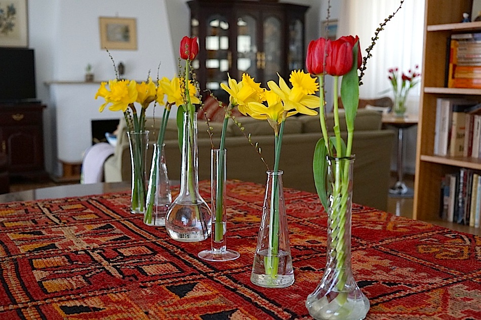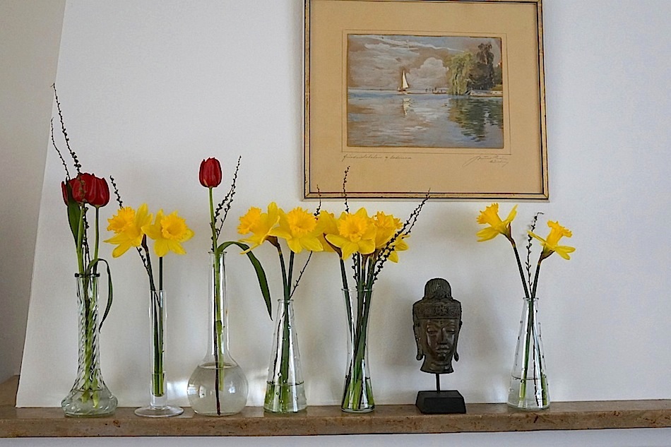On the dining room table, I placed a row of daffodils (also from the flower market) and some supermarket red tulips. I bought the assorted vases at a thrift shop recently, inspired by “pins” like this one.