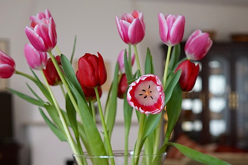 Then I moved the rest of my tulip purchase to the dining room table. . .