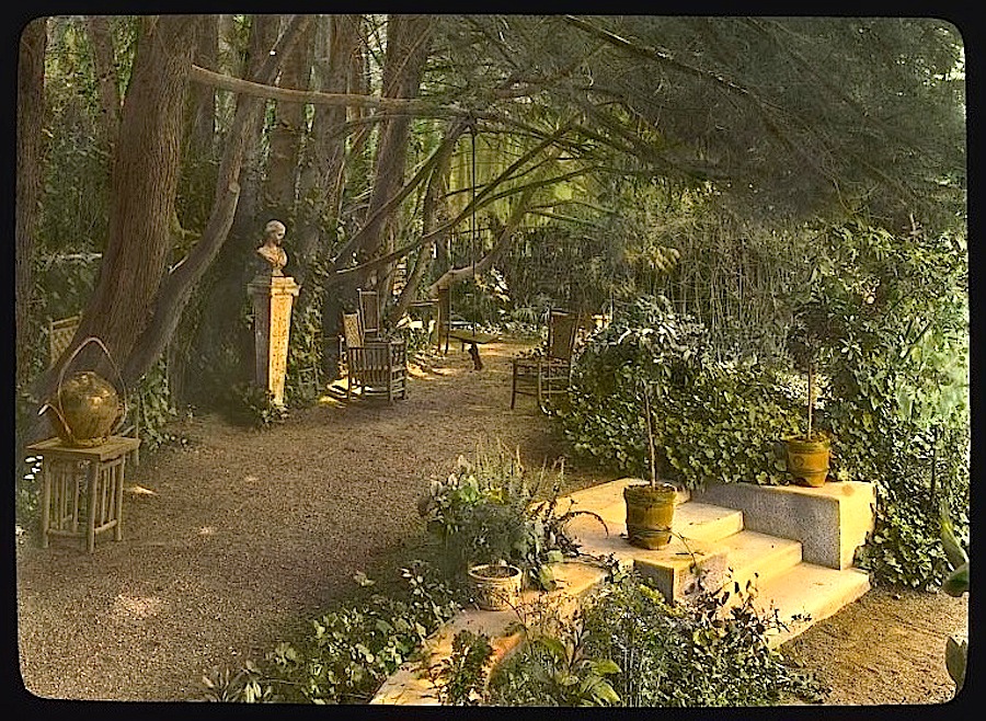 The garden terrace of the Myron Hunt house, 200 North Grand Avenue, Pasadena, California, 1917, a hand-colored glass lantern slide by Frances Benjamin Johnston, via Library of Congress Prints and Photographs Division.