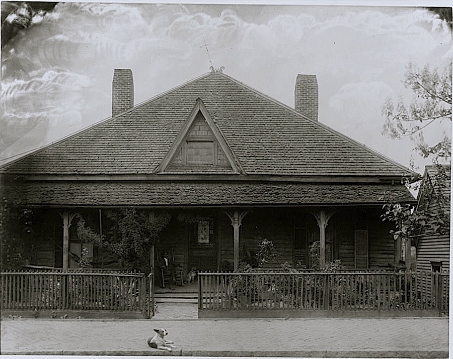 House with picket fence, man and dog seated on the porch.“[H]ouse with picket fence, man and dog seated on porch and a dog lying on the sidewalk,” Georgia, ca. 1899, photographer unknown, via Library of Congress Prints and Photographs Division.
