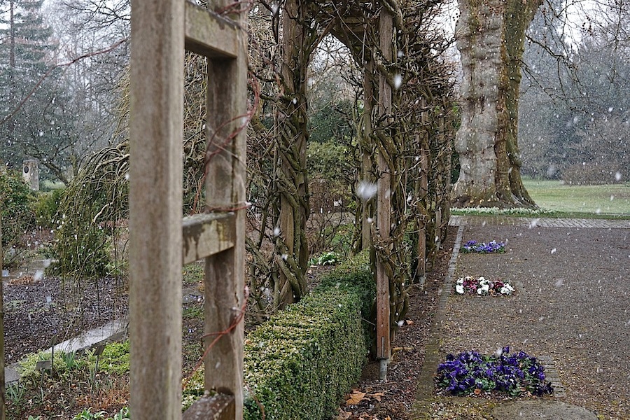 I went over to the University of Hohenheim’s Spielhaus garden for the first time in months yesterday to see what was blooming in mid April. The cherry trees that were so amazing this time last year had finished and the magnolias were also winding down. The perennial beds were still pretty subdued, except for this very nice bit just below the terrace and wisteria arbor.