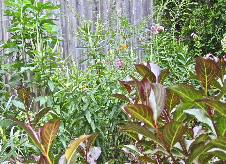 All the ornamental grasses look good, even the two miscanthus that are still sitting in their pots waiting to be planted after 6 weeks. My lamb’s ear looks great (I have the old-fashioned variety that flowers wildly; it’s messy, but I like it). The Rudbeckia laciniata is green and upright, but the leaves are drooping a little. My two little rosebushes (‘Cinco de Mayo’ and some small apricot David Austin) and a mature weigela with burgundy-tinged leaves (came with the garden) also actually look fresh.