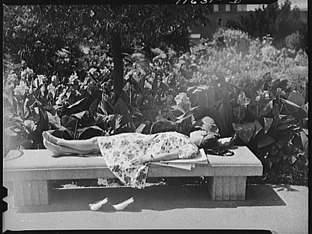 “Washington, D.C. Government employee taking a nap on a bench in the [U.S. Botanic] Garden,” September 1942, by John Ferrell, via Library of Congress Prints and Photographs Division.