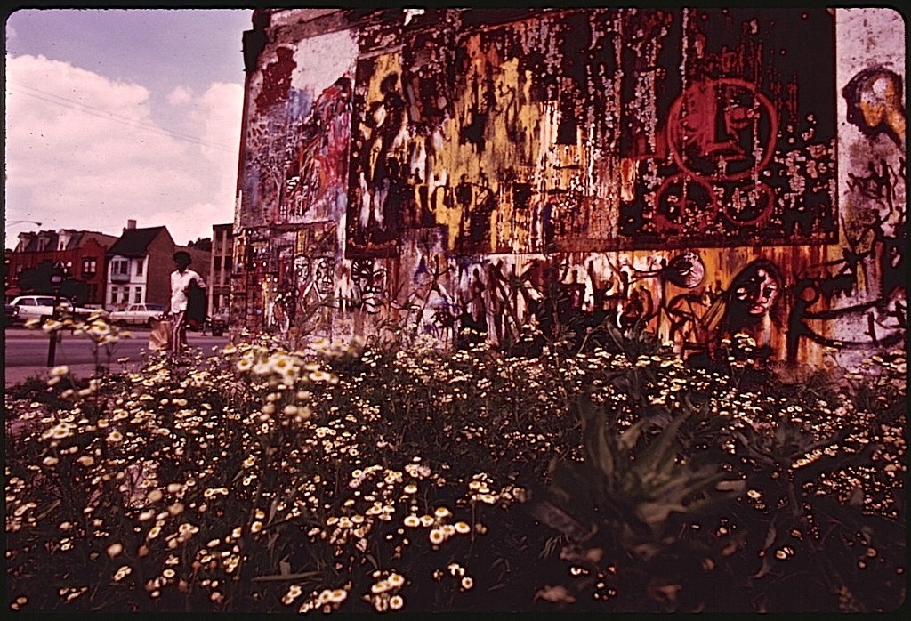 “Deteriorated wall mural adjacent to a vacant lot on 35th Street in South Side Chicago. Many Black artists are active in painting outdoor murals in the city’s Black communities. They feel it is a means of sharing art with people of the ghetto who never go to the museums.”