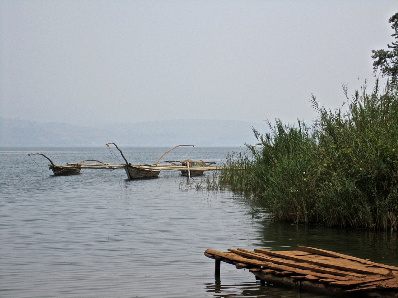 The Rwandan boats always remind me of cranes coming in for a landing.  The hills in the distance are in the DR Congo.