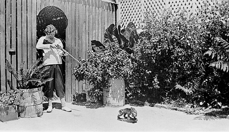 Edith Clark aiming a rifle at a plaster model of a lion, Palmer Street, Ararat, Victoria, ca. 1925, via The Biggest Family Album in Australia, Museums Victoria Collections.