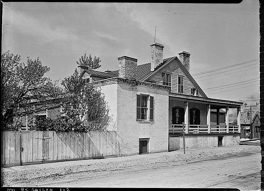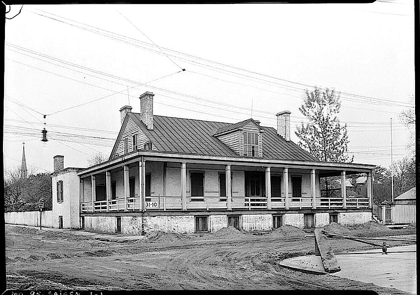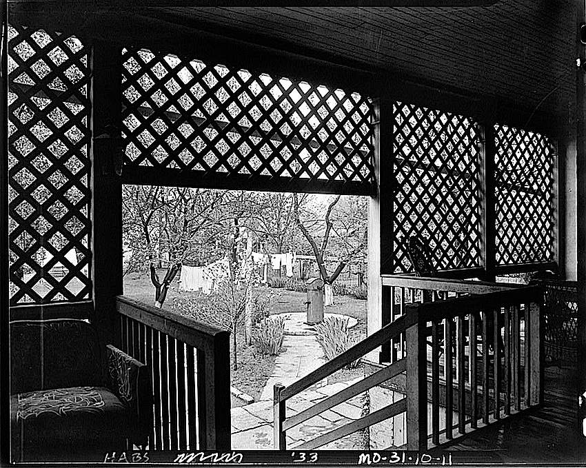 The front porch of the French Legation to the Republic of Texas, Austin, Texas, 1934, by Louis C. Page, Jr., via Historic American Building Survey (HABS), Library of Congress Prints and Photographs Division.
