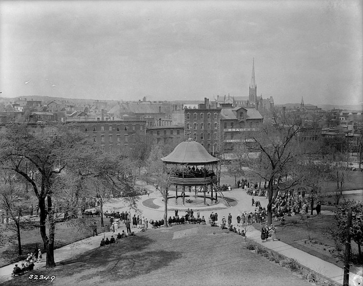 I think this photo was taken in the 1930s. The band climbed up a ladder to perform over the pool and fountain. The bandstand was built in 1908 and still exists today. It was refurbished in 2013.