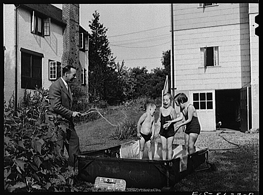 “Mr. Garrity building a wading pool in the backyard for his children,” Yonkers, New York, 1942, by Arthur Rothstein for U.S. Office of War Information, via Library of Congress Prints and Photographs Division.