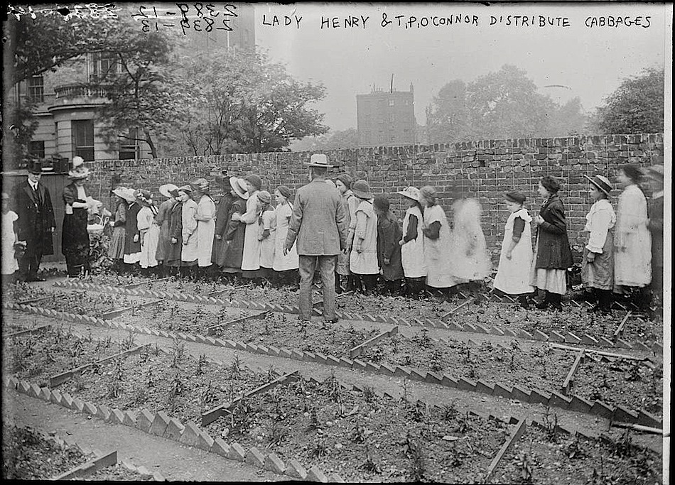 Lady Henry Somerset and T.P. O’Connor in a garden distributing cabbages to children, between ca. 1910 and ca. 1915, Bain News Service, via Library of Congress, Prints and Photographs Division.