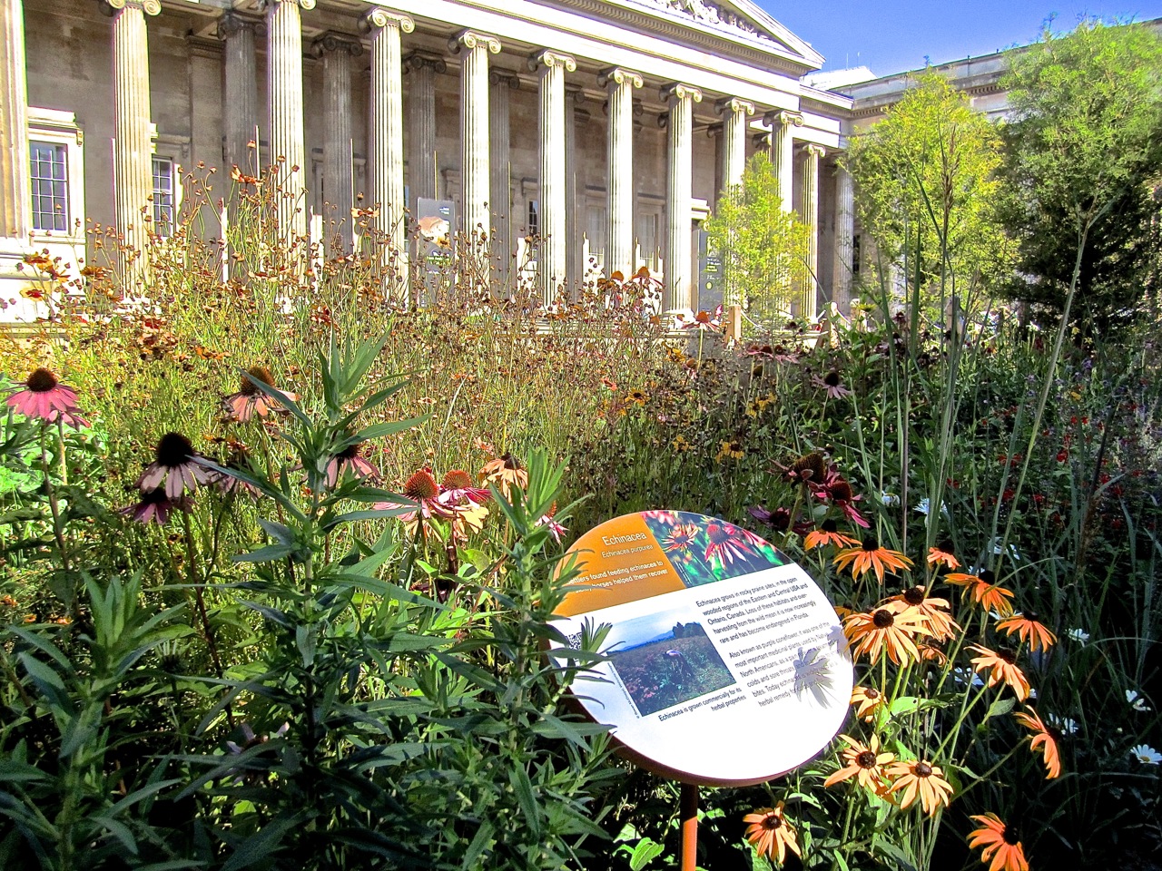 I didn’t make it to the Kew Royal Botanic Gardens on this trip*, but the British Museum was (and is, til November 25th) holding an exhibit, “North American Landscape: Kew at the British Museum” on its West Lawn. Admission is free.