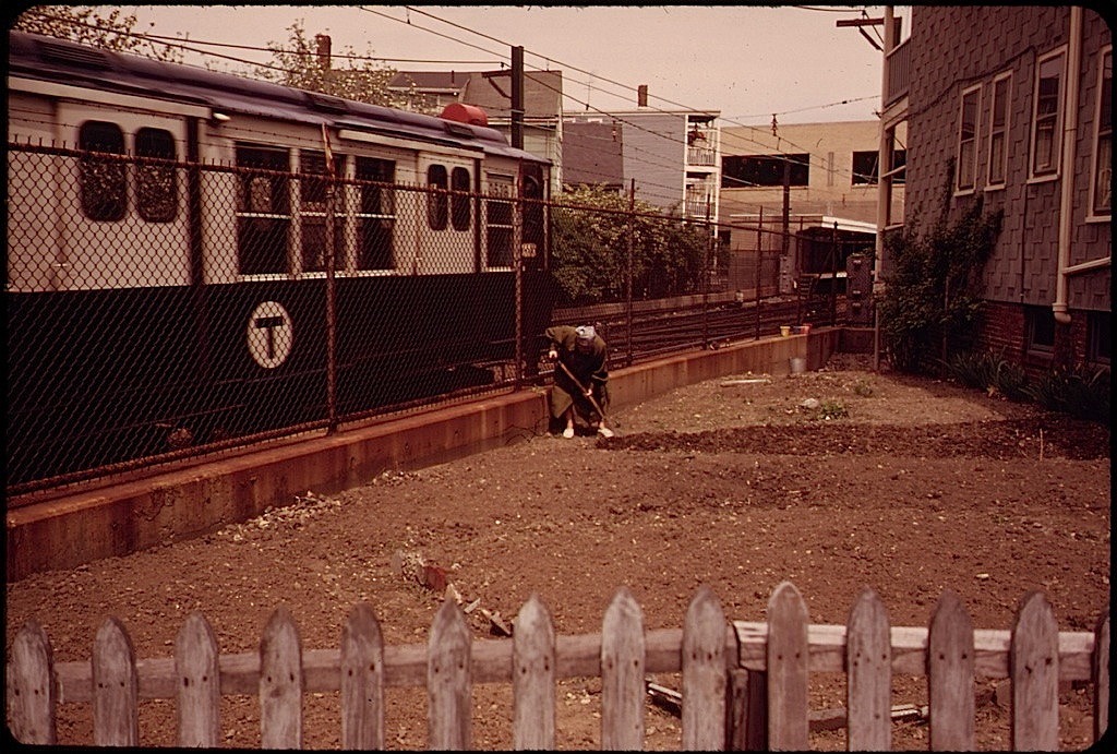 A woman turns her garden soil while a Massachusetts Bay Transit Authority train rushes past the northeastern side of Neptune Road in East Boston, Massachusetts.