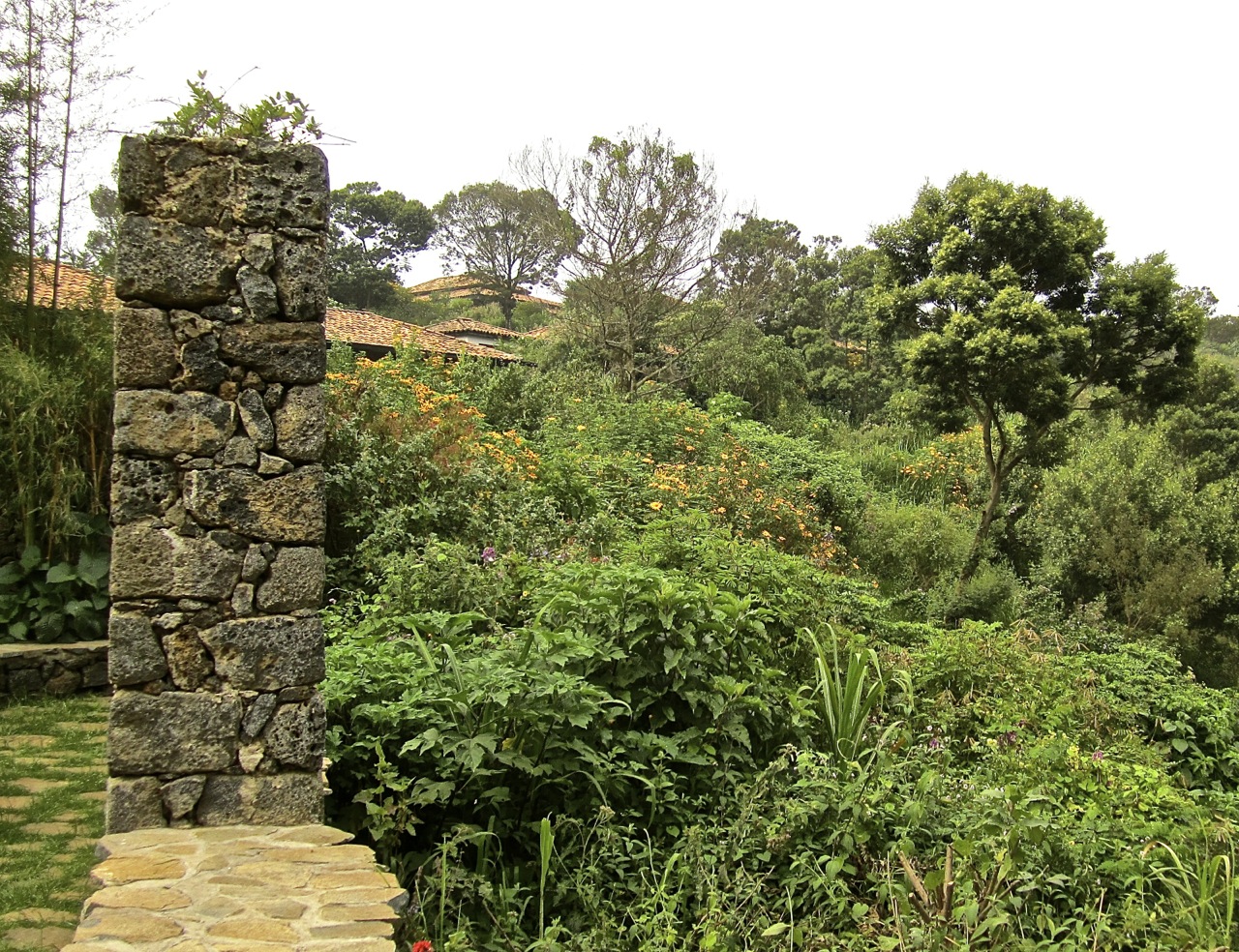 First, I would be grateful if anyone could identify the tropical plant with the very large leaves in the center above — and below with clover poking up through the leaves.