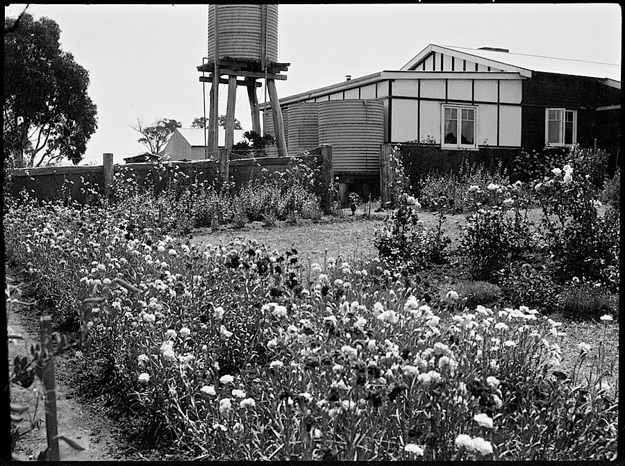 Garden bed of carnations (Dianthus caryophyllus) and water tank at Pine Range, Australian Capital Territory, ca. 1935 via National Library of Australia Commons on flickr.