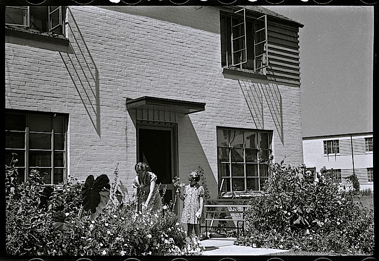 Mother and daughter cut flowers in their cottage style garden in Greenbelt, Maryland, near Washington, D.C., September 1938, by Marion Post Wolcott, via Library of Congress Prints and Photographs Division.