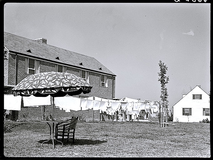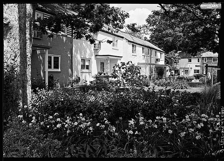 “Old Greenbelt” has been well preserved over the years and was designated a National Historic Landmark in 1997. The photo above shows some of its rowhouses with gardens in 2005. It was taken by James W. Rosenthal for an Historic American Buildings Survey (via Library of Congress).