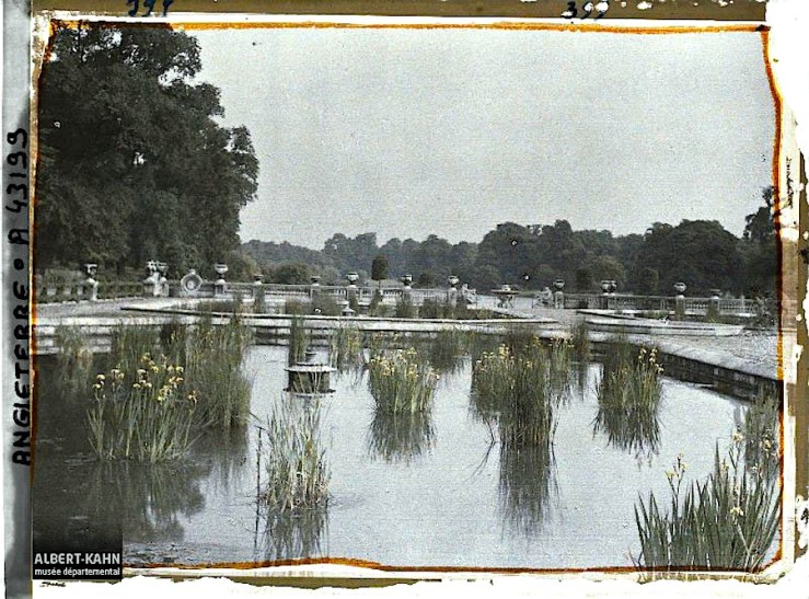 Yellow flag iris (I. pseudacorus) in the basins of the Italian Gardens of Kensington Gardens, London, June 1924, by Roger Dumas, via Archives of the Planet Collection – Albert Kahn Museum /Département des Hauts-de-Seine.
