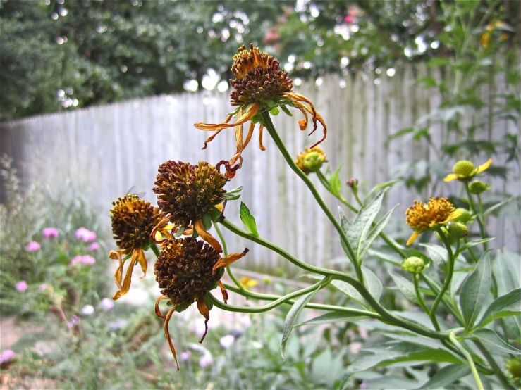 Below, the border continues on the left side of the steps. The tall yellow flowers are double Rudbeckia laciniata.