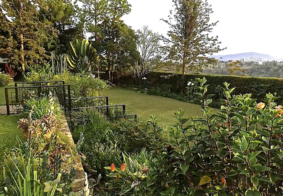 Below is the same border from the other direction, standing at the center steps. (The red-flowering shrub/vine at the end is a Mussaenda erythrophylla.)