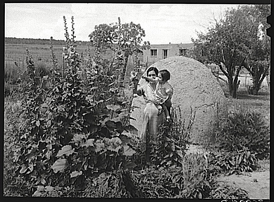 Woman and baby in a flower garden in front of an adobe oven, July 1940, Chamisal, New Mexico, (along the High Road to Taos) by Russell Lee, via Library of Congress Prints and Photographs Division.