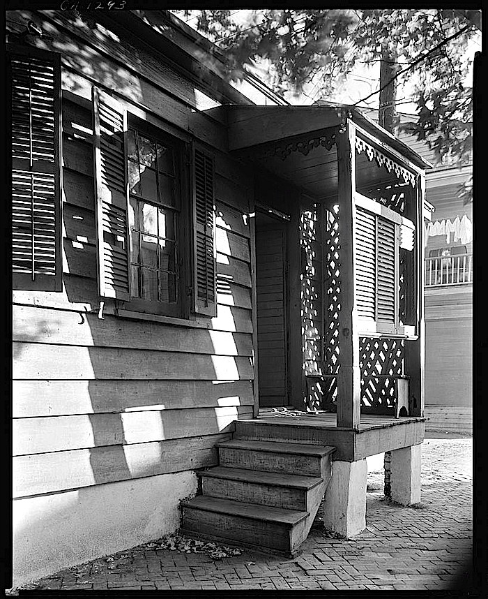 The Library of Congress catalogue entry for the image above includes the note: “Once in the ‘Restricted District,’ hence the lattice work” — meaning the house had been a bordello. (That would also explain the panel of shutters across the front.)