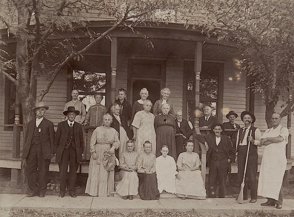 I suspect that this is the (semi-circular) porch of a boarding house and that the people are the residents and owners/employees.