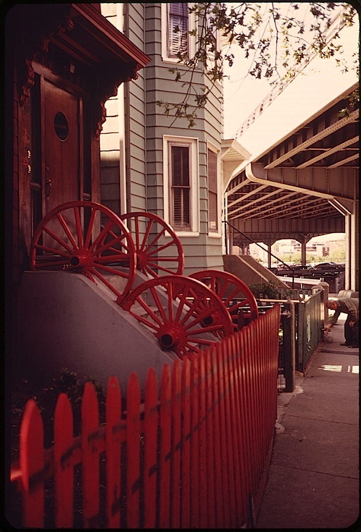 An unusual front stoop on Bennington Street in East Boston, near Logan Airport, next to the elevated East Boston Expressway, May 1973, by Michael Philip Manheim for DOCUMERICA, via The U.S. National Archives Commons on flickr.