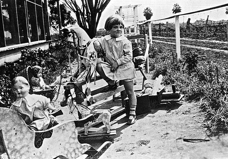 The queen poses in her side-yard kingdom with her horses and doll-courtiers, 1925, Euston District, New South Wales, via Museum Victoria.