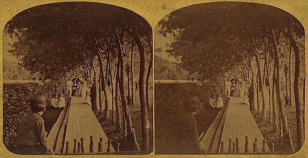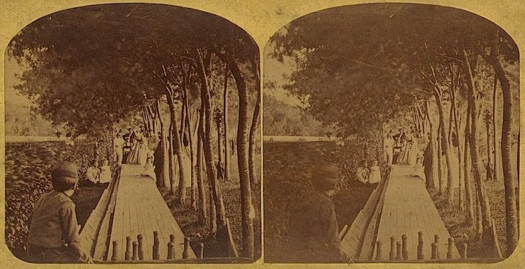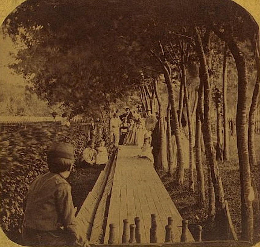 “Group of people bowling on a wooden lane erected in a yard,” July 4, 1861, via Library of Congress Prints and Photographs Division.