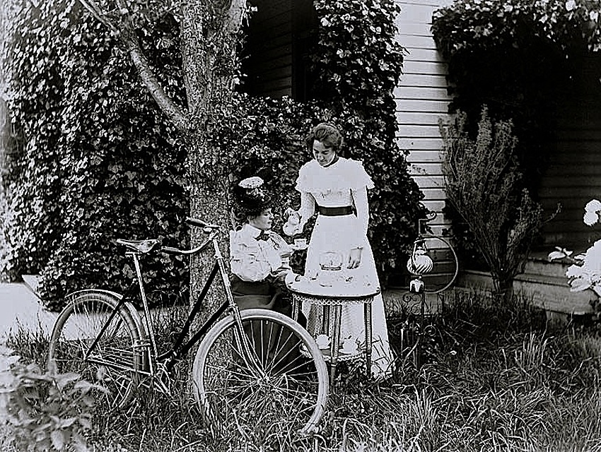 Young women of that time must have been pretty desperate to get out on their own — to bicycle in corsets, puffy high-necked blouses, and large hats.