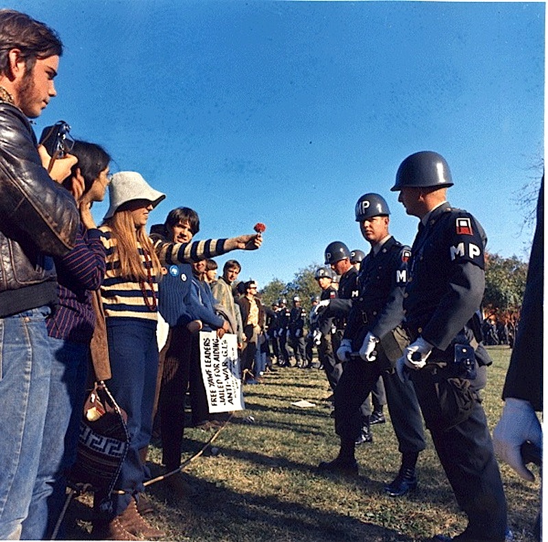 Anti-war demonstrators, National Archives on flickr“Female demonstrator offering a flower to a military police officer,” West Potomac Park or Pentagon grounds, Arlington, Virginia, October 21, 1967, by S.Sgt. Albert R. Simpson, via U.S. National Archives Commons on flickr.