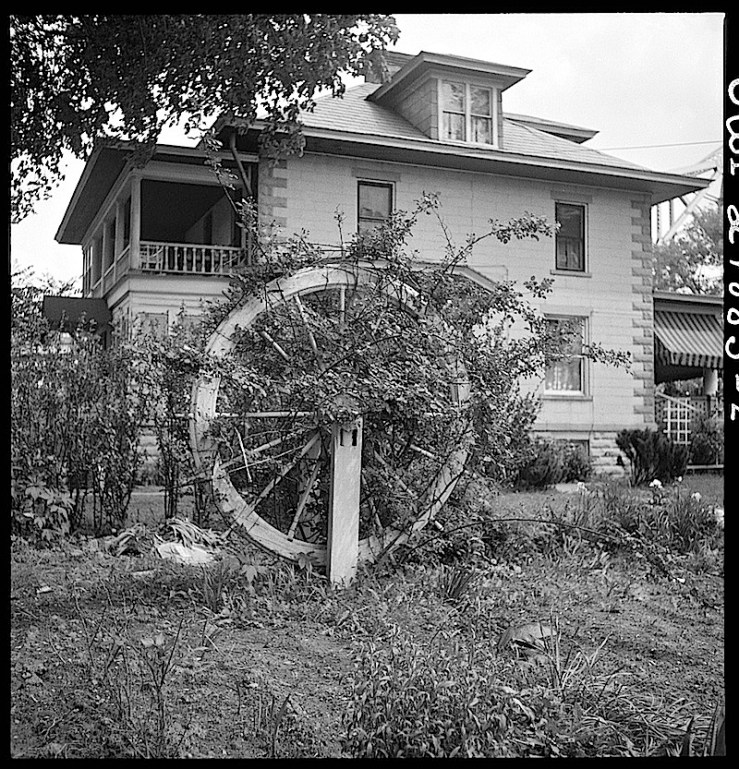 “A [river] pilot’s wheel stuck in the backyard of a retired pilot’s home,” Point Pleasant, West Virginia, May 1943, by Arthur S. Siegel, via Library of Congress Prints and Photographs Division.