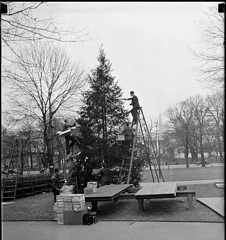 For most of the 1930s, the tree was installed in Lafayette Park, on the north side of the White House. In the photo below, workers (in suits) decorate the 1937 tree on December 23.