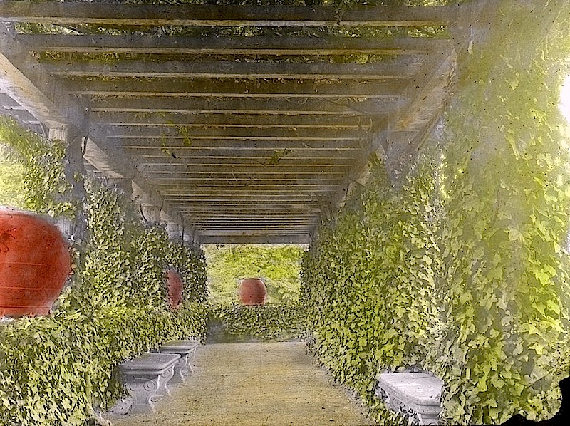 Pergola covered in wisteria and ivy in a garden of Villa Palmieri, Florence, ca. 1915, from the Arthur Peck Collection, via Oregon State University (OSU) Special Collections & Archives Commons on flickr.